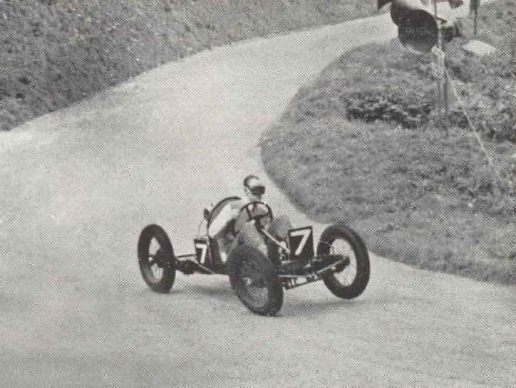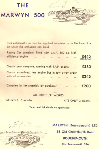 Another customer was Lord Strathcarron, a wartime RAF pilot and later a regular speaker on motoring matters in the House of Lords. He was employed as a "works" driver for weekly wage of £9 for 1948 and 1949 in spite of also being thrown from the car during a roll. Don Truman saw the failings of the first car and made a series of modifications to his, eventually becoming the Bardon Turner. Other Marwyns were modified by their owners including the Messenger JAP, Marott, driven by Denis Flather, SMS driven by Jeff Sparrowe, BRS by Jack Raper and MHM Triumph of JB Moncrieff. One car was exported to South Africa for Ernest Gearing who made his debut in June 1948 in a hill climb at Parow Quarry then rolled the car in its first race, the van Riebeeck Trophy, in October. One car was apparently exported to Canada for Major Persse but nothing is know of its fate Around half a dozen cars of the original design, were produced in all. BE Martin demonstrates the Marwyn's handling at Shelsley, September 1947